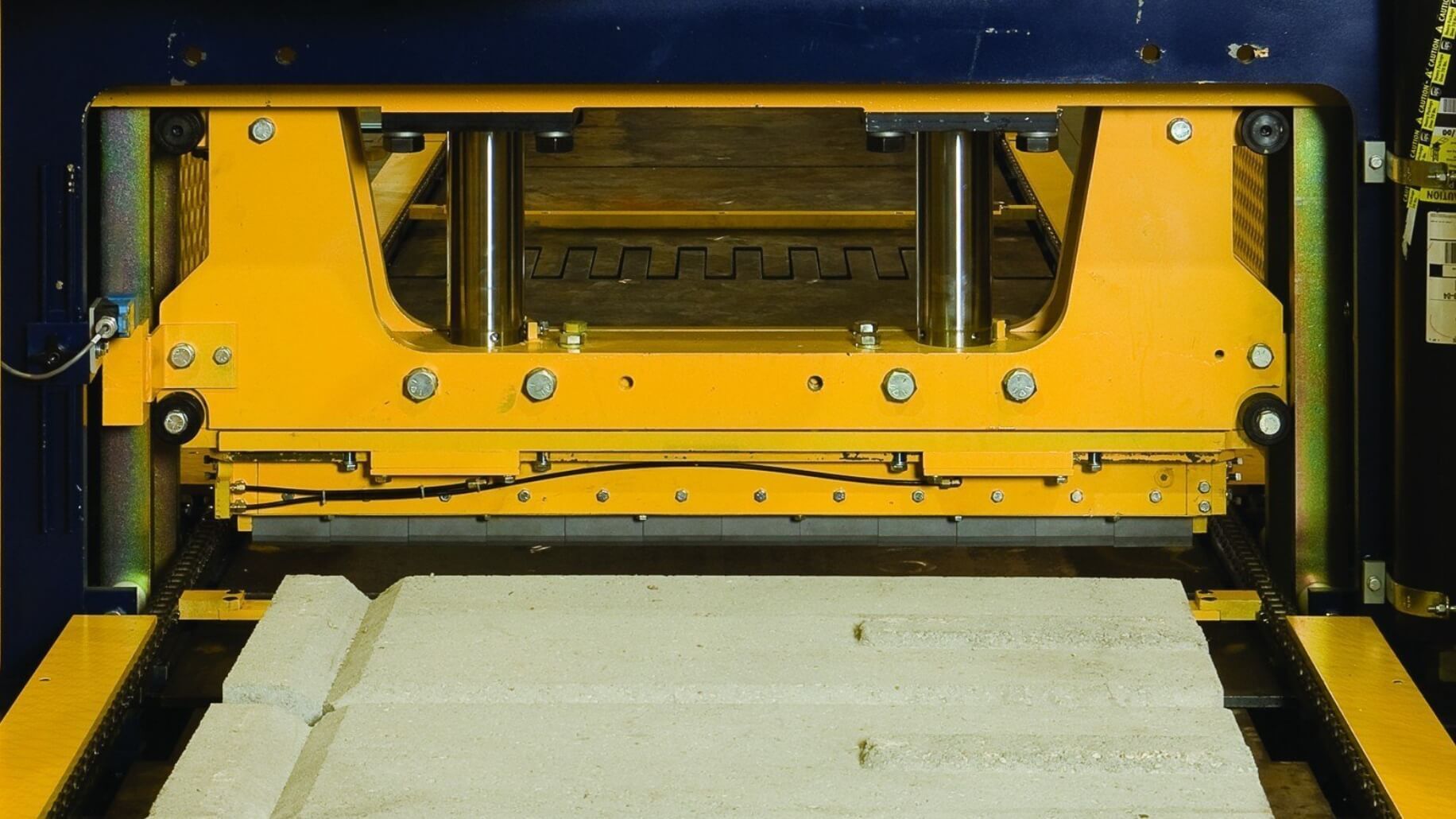 The V-200 splitter splits Novabrik™ in-line automatically and reorients the units for cubing. The V-200 simultaneously splits four brick per cycle and handles four units in four rows to keep up with the concrete products machine.