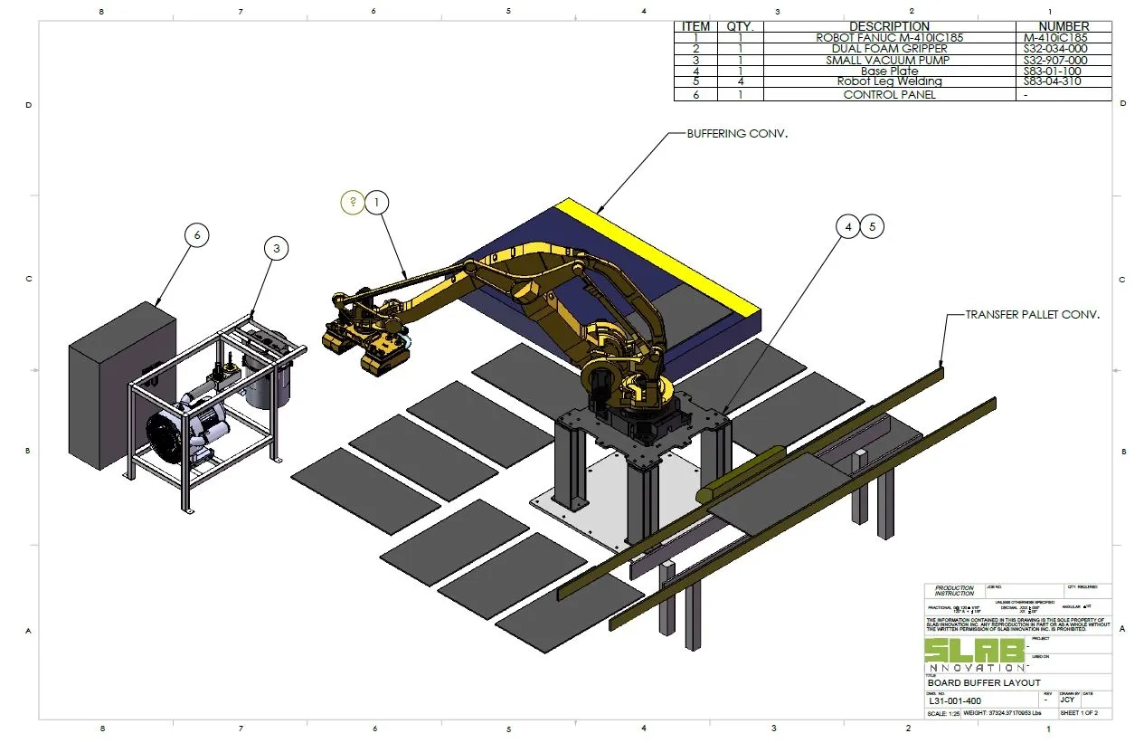 Cubing products off production boards, or decubing them for offline processes, we've got you covered. Using either a clamp gripper or vacuum gripper, the versatility of a robotic cubing / decubing solution is unmatched. This system can match a variety of layouts including small footprints. This system can also handle wood pallets, tier sheets/paper/foam, and more!